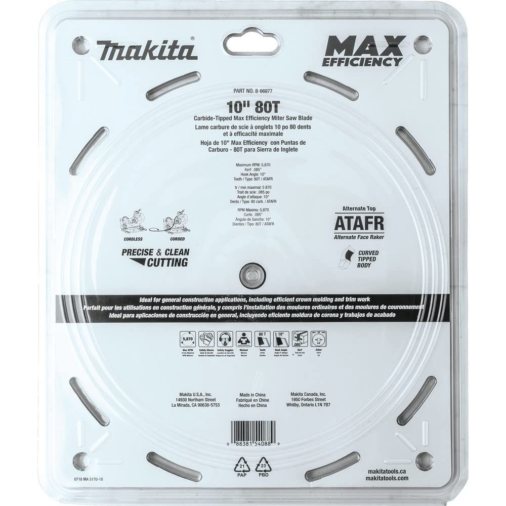 Makita B-66977 10″ 80T Carbide-Tipped Max Efficiency Miter Saw Blade