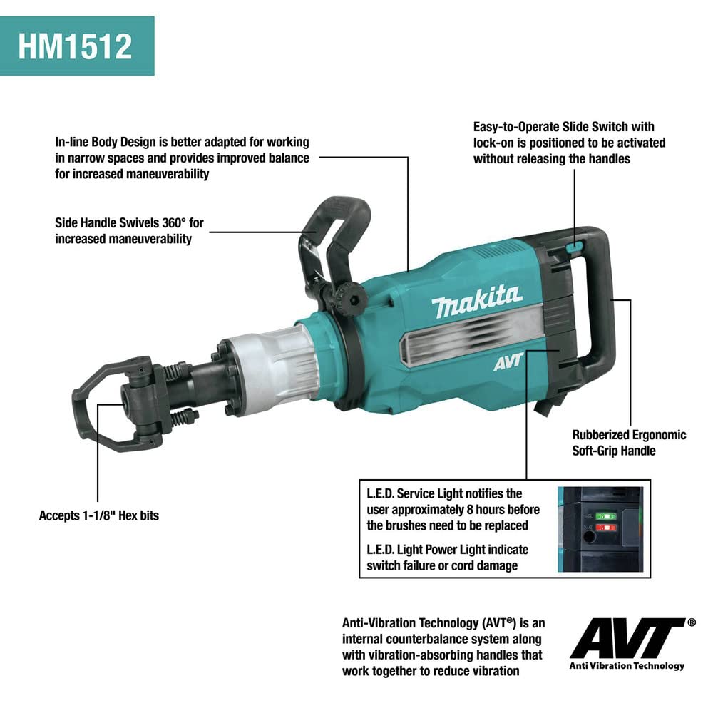 Makita HM1512 45 lb. AVT® Demolition Hammer, accepts 1-1/8″ Hex bits