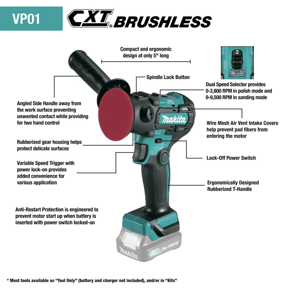 Makita VP01Z 12V max CXT® Lithium‑Ion Brushless 3″ Polisher / 2″ Sander, Tool Only