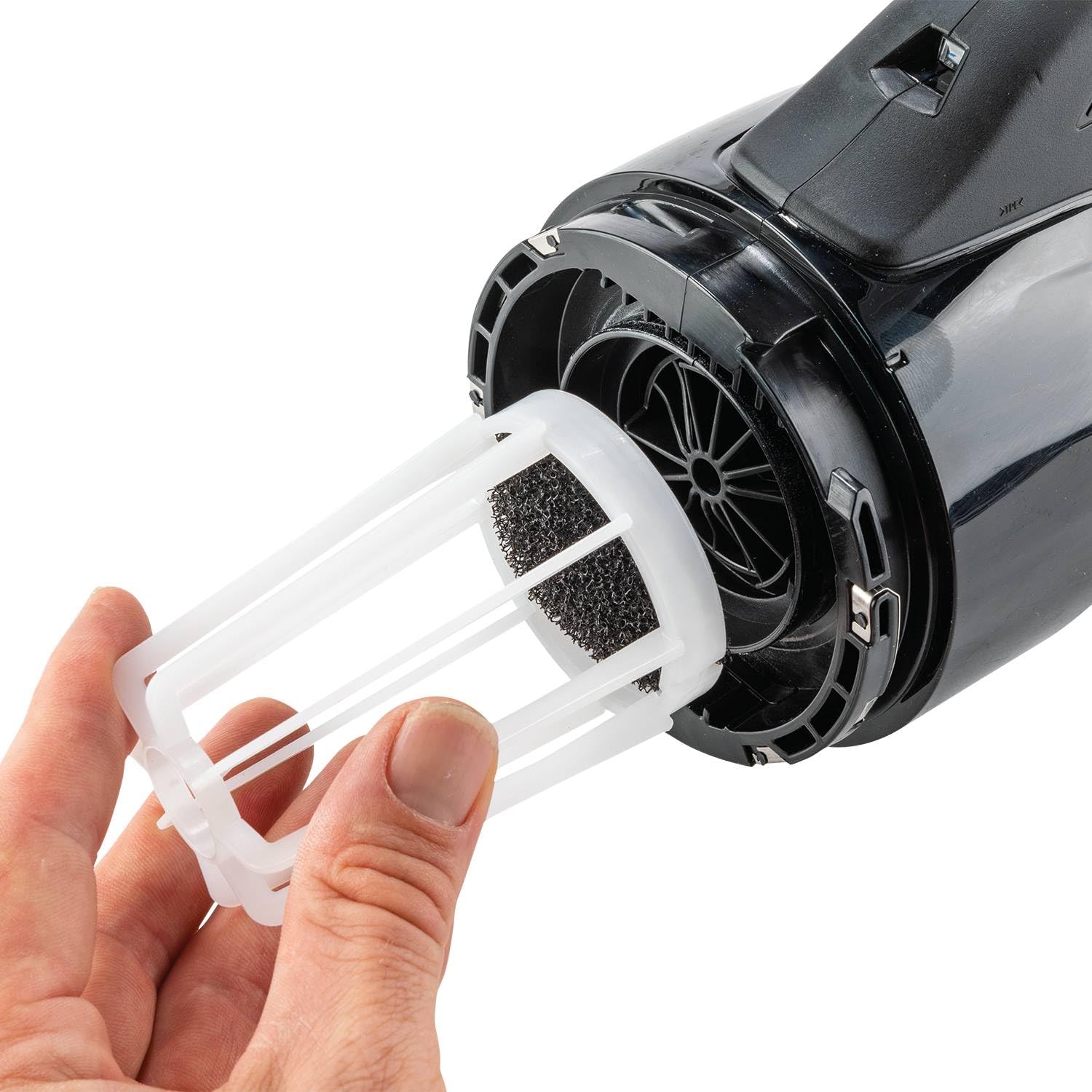 - Bagless cloth filtration system allows for easier cleaning and quicker debris disposal